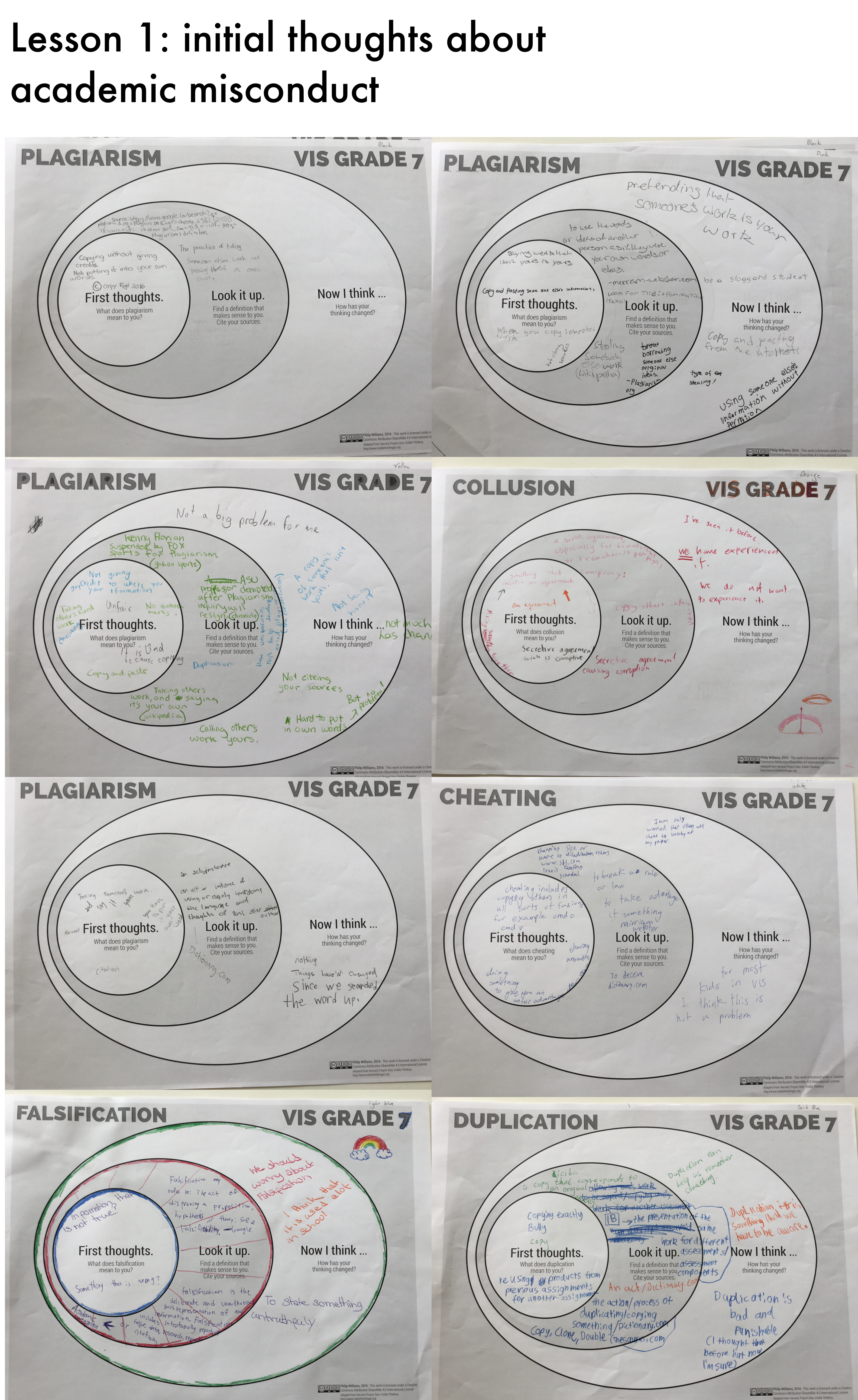 Rather than launching into a lecture on academic honesty in lesson 1, a far more respectful and holistic approach was to invite dialogue that allowed us to gain a deeper understanding about the perceptions, perspectives, conceptions and misconceptions the students already had and how these changed as we progressed through the lessons together. Invariably, when we ask for student opinions, we will always be faced with new and expected insights that lead us to new understandings which is vital to this whole process.
